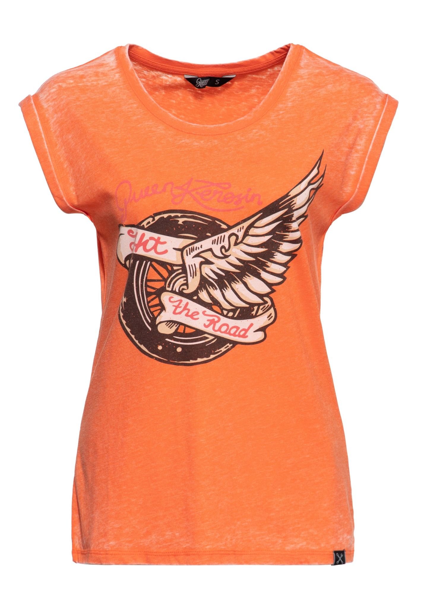 La Camiseta Hit The Road Wheel Mujer de la marca de culto Queen Kerosin es rocosa y casual! El lavado enzimático en combinación con un llamativo estampado frontal y las mangas remangadas le dan a tu día a día un look que se completa hábilmente con el cómodo y femenino corte entallado. La mezcla de materiales de alta calidad de algodón y poliéster garantiza una piel agradable y aireada y comodidad. Combinado con tu chaqueta vaquera y de cuero favorita, podrás lucir perfectamente tu nueva prenda.