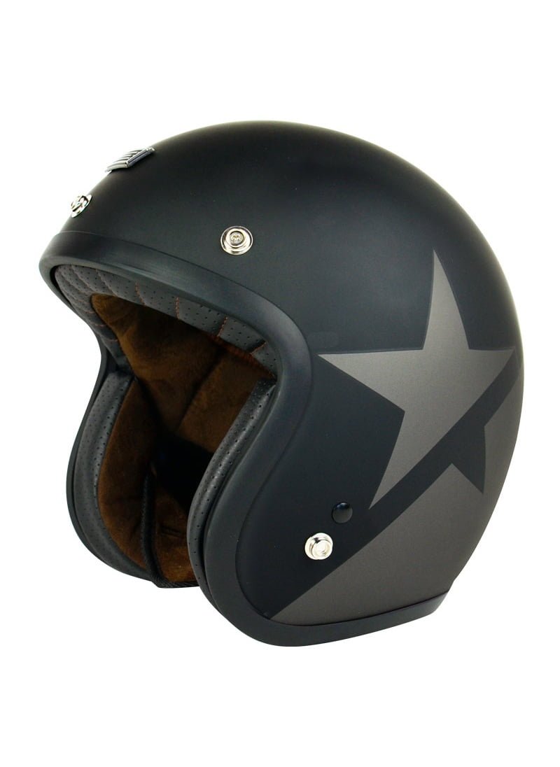 Con una estrella negra y blanca en cada lateral del casco. También incluyen una tira de cuero en la parte trasera para fijar las gafas de aviador tan comunes en el mundo café racer.