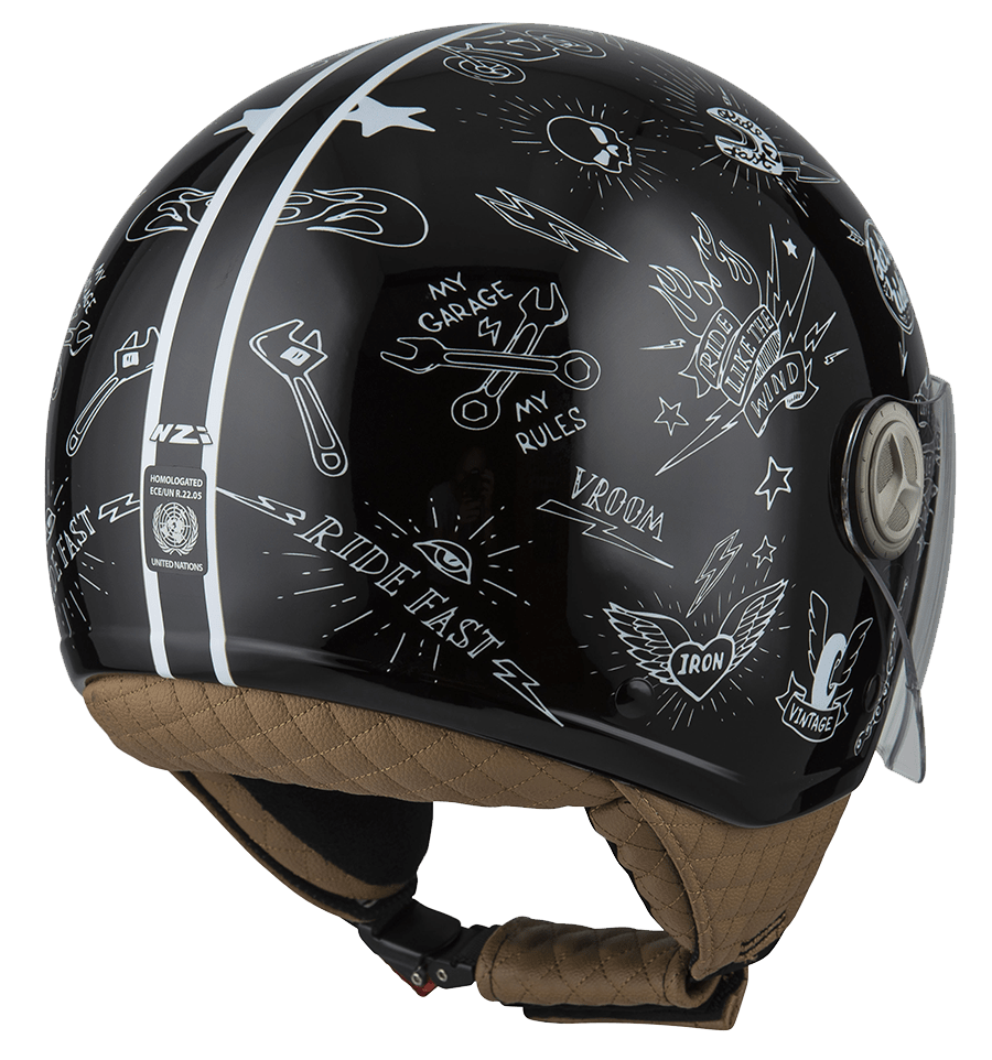 El Casco NZI Zeta 2 Stickers es un Jet muy compacto de estilo retro. con graficas muy original estilo garaje y life style para quienes no le gustan los cascos aburridos el interior está hecho de cuero sintético y está equipado con una pantalla 3D transparente. La ciudad es tuya y tu marcas la diferencia