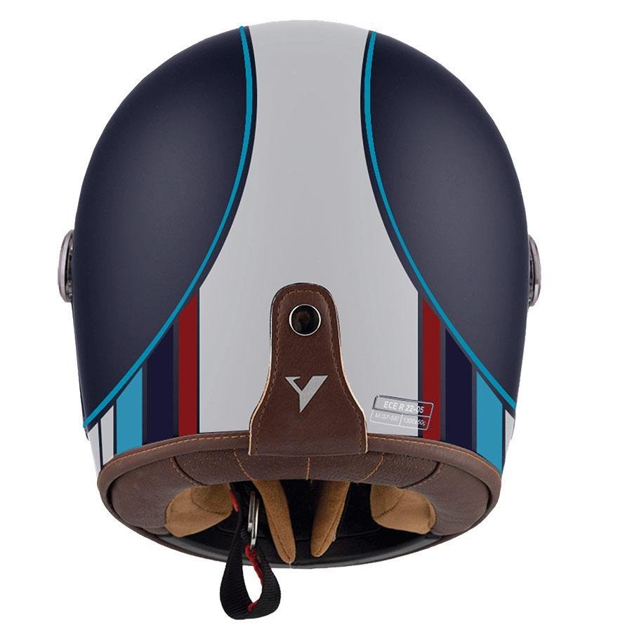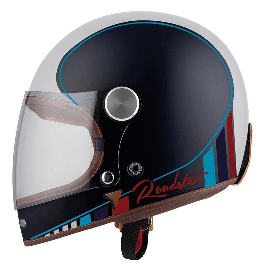 Casco Roadster II Dark Blue de By City. Un casco integral retro confortable, funcional y seguro, ha sido diseñado para aquellos que buscan una estética clásica. Con un diseño muy compacto y refinado, con interiores y acabados en piel, cuenta con sistema de fijación de doble anilla fácil de usar y para un ajuste perfecto. Acolchados interiores desmontables y lavables. Pantalla inyectada que asegura una visión clara bajo cualquier condición climática. Homologación ECE/UN R.22.05