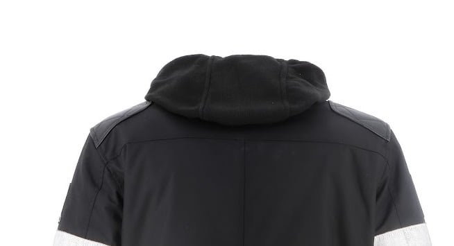 Las franjas blancas en las mangas y los hombros en piel le dan a la chaqueta un aspecto moderno y deportivo, mientras que el gorro extraíble proporciona una mayor protección contra los rayos del sol. La presencia de parches delanteros y un gran logo impreso en el interior de la chaqueta, refuerzan su estilo informal y urbano.