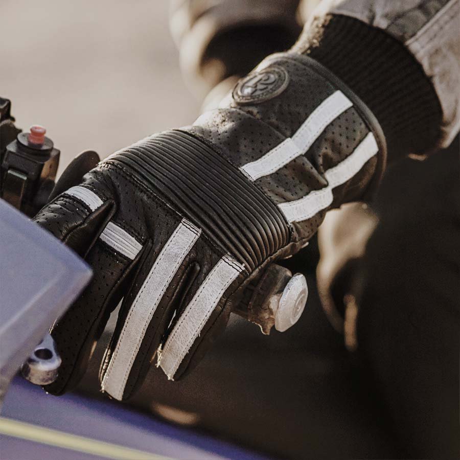 Guantes de motoristas fabricados en piel de primera calidad y refuerzos de aramida en la palma. Función táctil en los dedos índice y corazón y ajustable en la muñeca.
