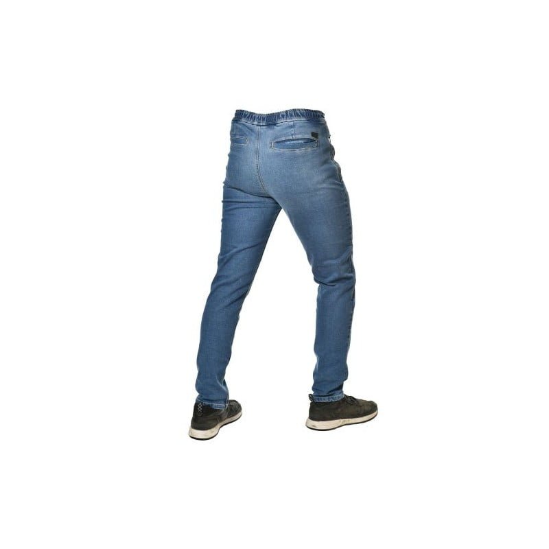 Los vaqueros para hombre ENZO. homologados con el nivel AA segun la norma EN17092. combinan detalles deportivos con un look urbano. Estan equipados con protectores de cadera y rodilla homologados de nivel 2. El corte recto y la cintura elastica ajustable con un cordon le dan una identidad unica. Tambien lleva cremalleras laterales invisibles para facilitar la insercion de protectores de rodilla.