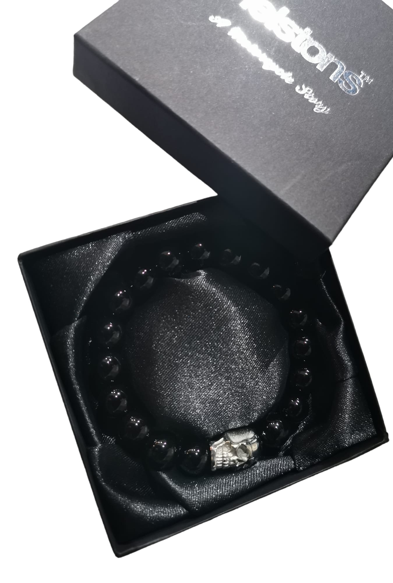 La Pulsera Helstons Negro Skull está realizada realizada cuentas de piedras de Onix negro de alto grado.